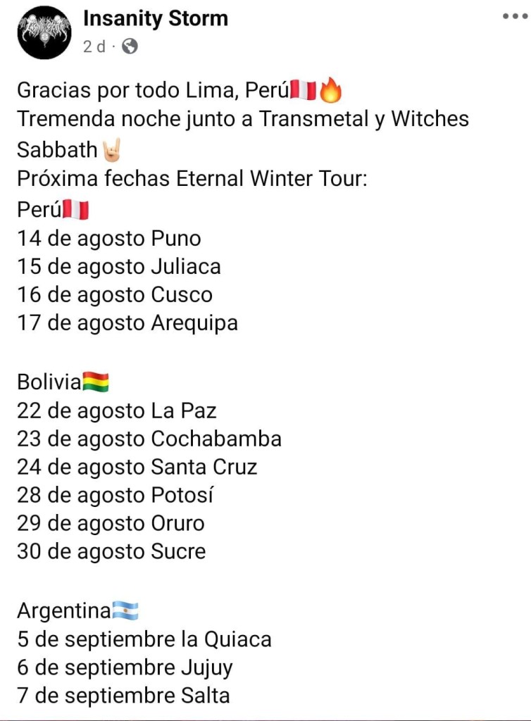 La banda chilena de Black Metal, Insanity Storm, está causando un impacto sin precedentes en su gira actual por Sudamérica. Con una mezcla perfecta de oscuridad y furia, esta banda está conquistado a los públicos de Chile, Perú, Bolivia y Argentina.